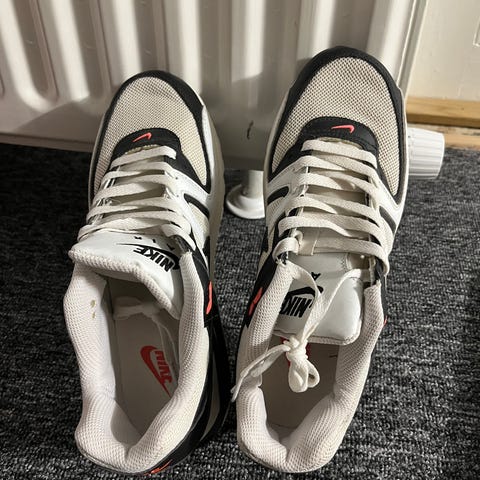 Nike sneakers i str. 43. Modellen er i grå og sort med hvide detaljer. Overdelen er i tekstil og syntetisk materiale med snørelukning. Skoene har en kraftig, mønstret ydersål og synlige støddæmpende elementer i hælen. Velegnet som hverdagssko eller til let træning.