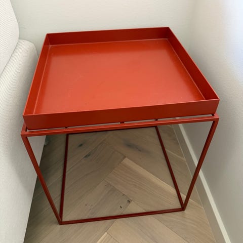 Flot rødt bakkebord, sødt som blomsterbord og også anvendeligt som fx sofabord, sengebord, ekstra bord mv.