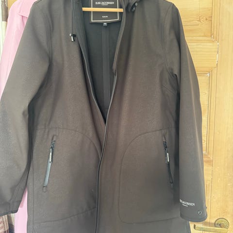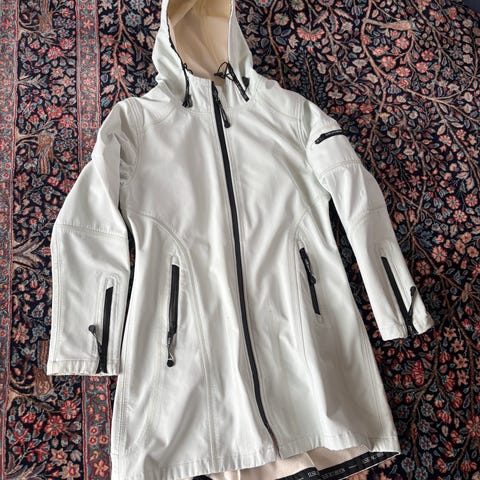 Ilse Jacobsen jakke til dame i str. 40. Jakken er beige og fremstillet i polyester. Den har gennemgående lynlås foran med kontrastfarve, lynlåslommer i siderne samt hætte. Modellen er en længere jakke, der dækker ned over hofterne, egnet til hverdagsbrug og overgangsvejr.