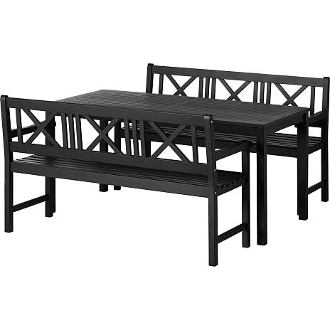 Havemøbelsæt med bord, bænk og to stole i sort.