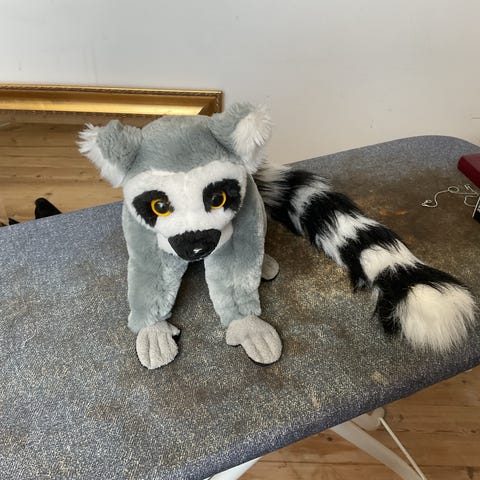 Meeko. Bamsen har lyse og mørke grå nuancer med sorte detaljer på poter og hale. Velegnet som krammebamse til børn. 20 cm. Uden hale.