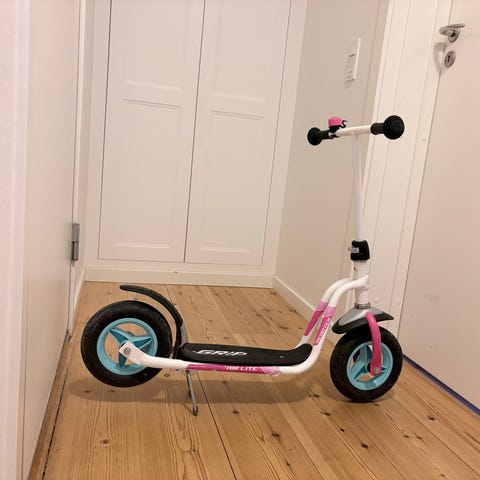 Puky løbecykel med 3 hjul i pink. Modellen har et stort forhjul og to mindre baghjul, som giver ekstra stabilitet til mindre børn. Super godt løbehjul til 2-4årig i god kvalitet fra PUKY. Meget velholdt, fejler intet.