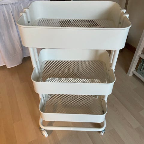 IKEA RÅSKOG rullebord/rullevogn i hvid metal med tre hylder. Måler 35x45x77 cm og står på hjul, så det er let at flytte rundt. Hylderne er perforerede for ventilation og afløb. Velegnet som ekstra opbevaring i f.eks. køkken, badeværelse, kontor eller stue.
