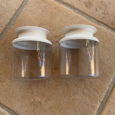 Tupperware plastbøtter med låg i orange og lilla. Sættet består af runde beholdere med tilhørende tætsluttende låg i matchende farver. Beholderne er velegnede til opbevaring af madvarer i køkkenet, fx rester, snacks eller madpakker. Fremstillet i robust plast, der kan bruges igen og igen. Farverne gør det let at skelne mellem indhold i de forskellige bøtter.