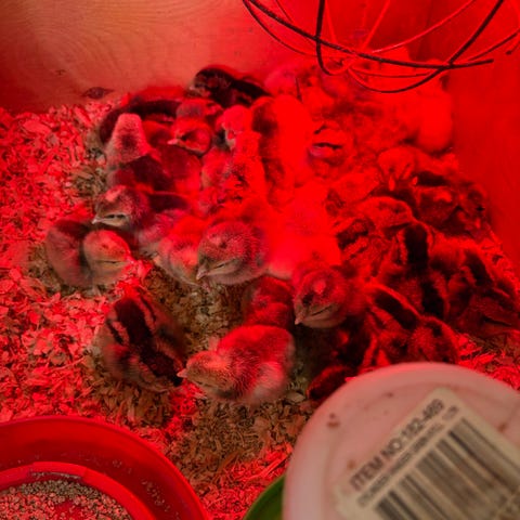 Daggamle kyllinger i blandede farver. Kyllingerne ses på billederne i både lyse, brune og mørke farver. De går på spåner i et opvarmet område.