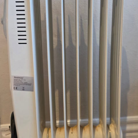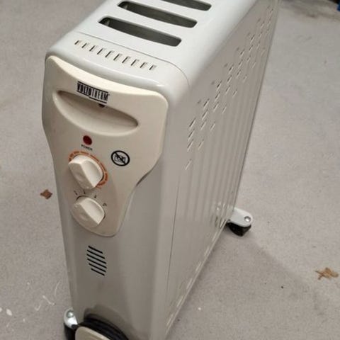 Heatmax olieradiator i hvid. Radiatoren har flere ribber og står på hjul for nem flytning.