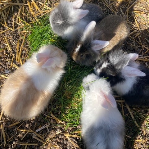 8 stk løvehoved kaninunger sælges - 1 lys, en grå, 6 brun meleret. Begge forældre haves.