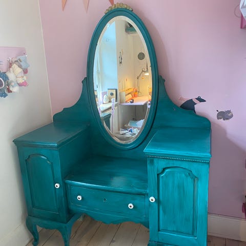 Lille væghængt bord med skuffer og spejl.