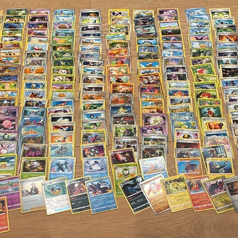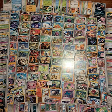 Min søn sælger sine mange Pokemon Kortene omfatter forskellige typer, herunder Pokémon-kort, trænerkort og energikort i flere farver og motiver. Velegnet til samling eller som udvidelse af eksisterende kortspil.
