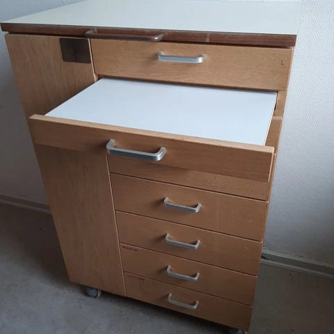 B-Line Boby rullevogn i cremefarvet plast. Vognen har flere åbne hylder og lukkede rum med svingbare og udtrækkelige sektioner, som giver fleksibel opbevaring. Den står på hjul, så den er let at flytte rundt. Egnet til opbevaring i f.eks. kontor, stue, værksted eller hobbyrum.