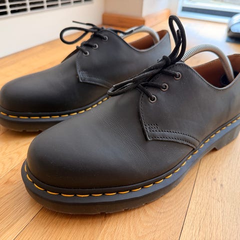 Dr. Martens 11838 sko i størrelse 41. Klassiske snøresko i sort glat læder med gul syning langs sålen. Indersål i læder med Dr. Martens-logo. Ydersål i gennemsigtig gummi med mønster for bedre greb.