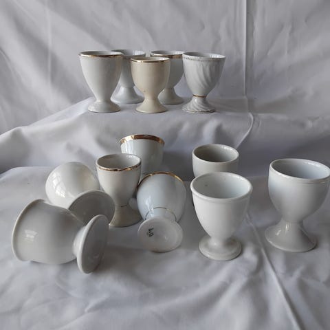 Fajance, Æggebæger, 3 stk ens blå hvide med skibe Æggebæger ældre