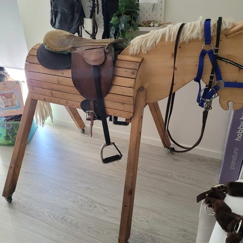 Træhest med saddel og hovedtøj. Hesten er 126 cm over ryggen, bygget af tømrer, den kan hæve og sænke hovedet, hale og man kan flettes-hvilket indbyder til mange timers leg.