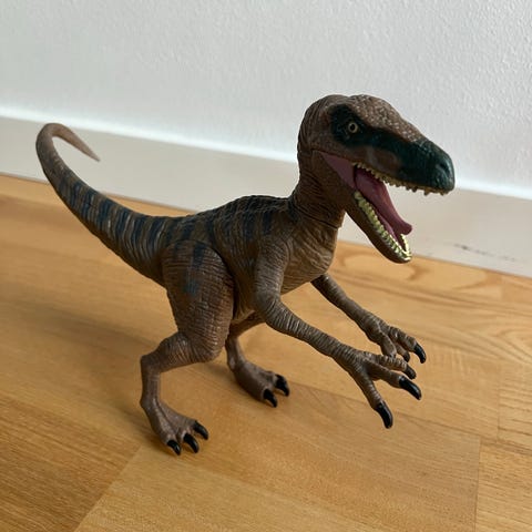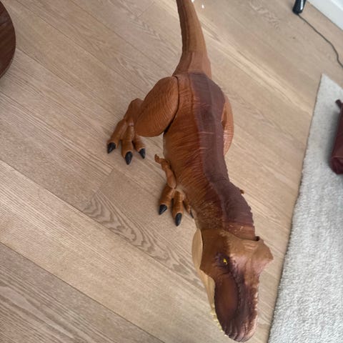 Tyrannosaurus rex-dinosaurfigur, som er 99 cm lang. Den kan 'sluge' minidinoer. Du skal blot låse maven op for at slippe dinoerne fri igen.