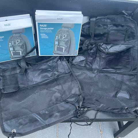 Organiser til bilsæde med flere lommer i grå og sort. Forsiden har to mindre stoflommer og én større netlomme nederst til opbevaring af fx legetøj, flasker eller småting. Øverst er der et bredt netfelt. Bagsiden har justerbare stropper til fastgørelse omkring bilsædet, så organiseren kan hænge på bagsiden af forsædet. Fremstillet i let, aftørringsvenligt materiale egnet til brug i bil.