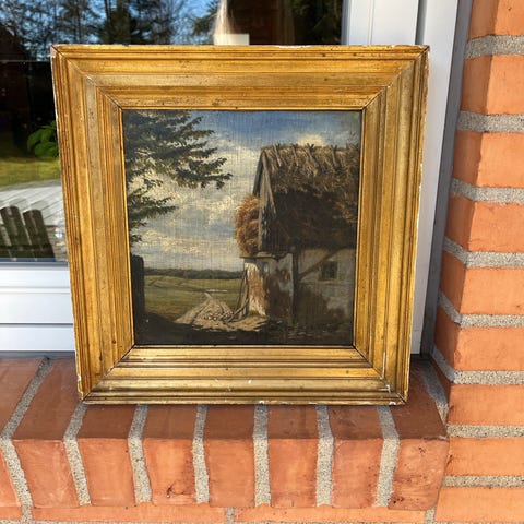 Maleri med bondekvinde og børn i guldramme