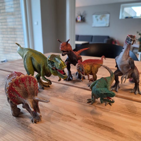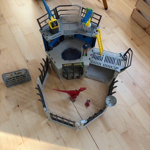 Schleich Dinosaurs legesæt med dinosaurer og figur. Sættet består af en dinosaurstation med indhegninger, hegnssektioner, port og arbejdsområde. Der medfølger flere dinosaurfigurer, en menneskefigur samt tilbehør som køretøj, kran og kasse.