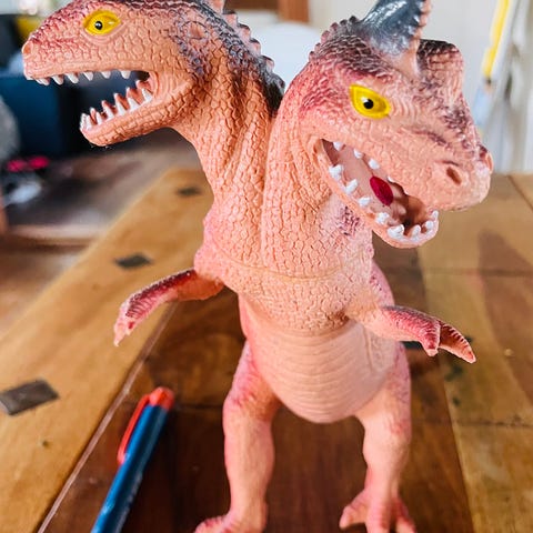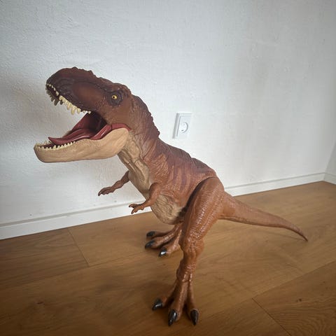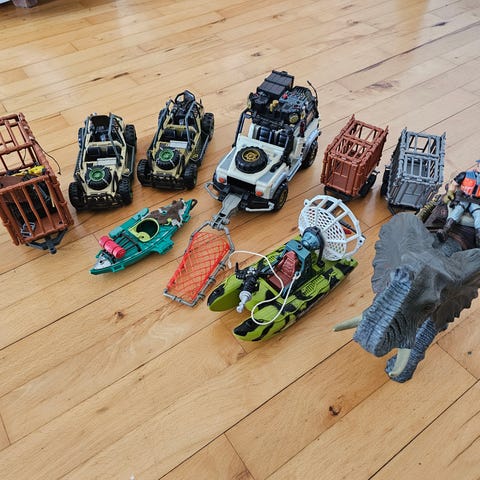 Dinosaursæt legetøj med stor grøn dinosaur, terrængående bil, helikopter og actionfigur.