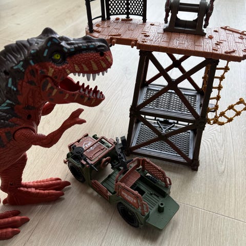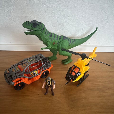 Sættet består af en grøn lastbil med aftagelig trailer og bur til dinosaur, stor dinosaurfigur samt mindre dinosaurfigurer. Der medfølger menneskefigurer og forskelligt tilbehør som våben og værktøj.