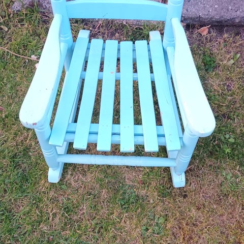 børnestol i træ i lysegrøn farve. Klassisk model med lige ben og ryglæn med to tværgående rygstykker. Stolen er i børnestørrelse og egner sig til brug ved børnebord, i legeværelse eller andre steder, hvor der er behov for en lav stol til børn. Overfladen er malet og viser almindelige brugsspor. Velegnet til indendørs brug.