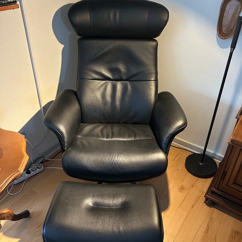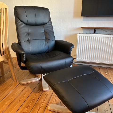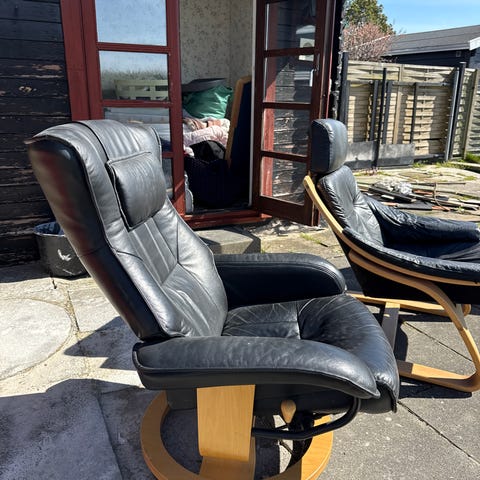 To lænestole i læder og træ med skammel og vippefunktion. Giv et bud