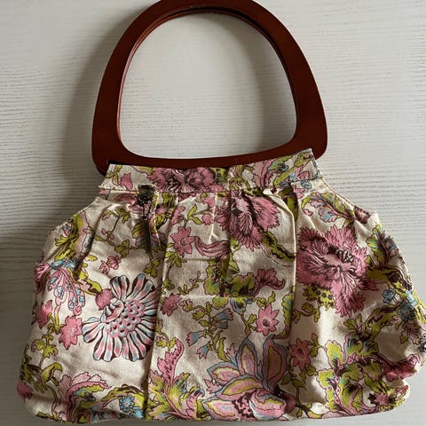 Dame stof håndtaske, cremefarvet med flæsedetaljer