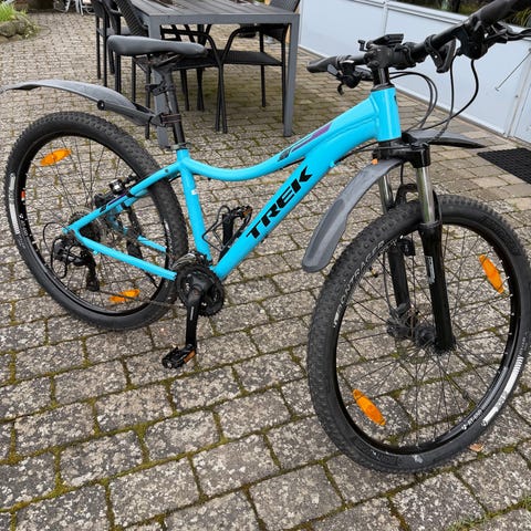 Trek børnecykel. Cyklen har mountainbike-inspireret stel med affjedret forgaffel og brede dæk, der egner sig til både hverdag og lettere terrænkørsel. Udstyret med skærme for og bag samt støtteben. Velegnet til større børn, der har brug for en cykel med god stabilitet og kontrol.