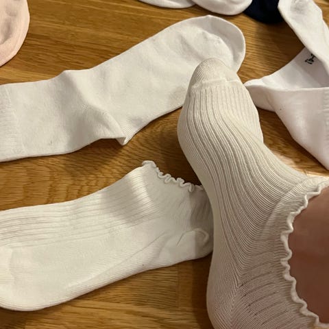 H&M sokker/strømper/tennis sokker/crew socks i bomuld til kvinder i one size. Sættet består af flere par sokker i forskellige farver og mønstre, herunder hvide, sorte og lyserøde varianter med striber. Sokkerne er fremstillet i bomuldsmateriale, som giver en blød og behagelig pasform. Velegnet til daglig brug og kan bruges til både sneakers og andre typer sko.