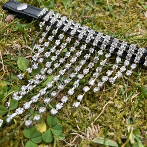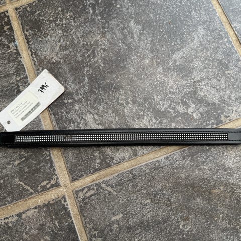 Karlslund pandebånd i sort læder med blå sten langs kanten. Pandebåndet har buet V-formet design.