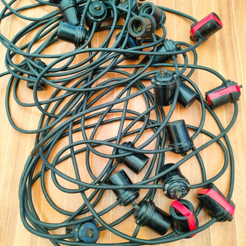 Samling af industristik og forlængerledninger til kraftstik. På billederne ses forskellige røde, blå og grønne CEE‑lignende stik og koblinger, både han- og hunstik, samt flere forlængerledninger i forskellige længder. Der indgår også fordelerdåser, stikdåser og en mindre fordelingstavle med automatsikringer og udtag. Velegnet til opbygning eller udvidelse af midlertidige elinstallationer, f.eks. på byggepladser, i værksteder eller til