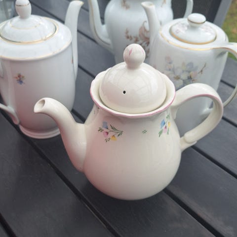 Porcelæn og bestik, kafetallerkner, underkopper, sukkerskålen, kaffekanden