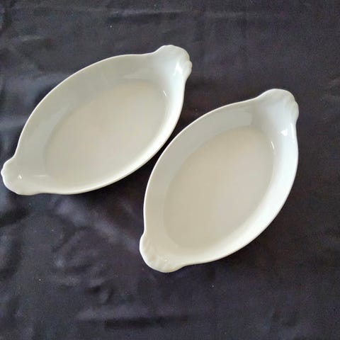 serveringsfad i ovalt design af hvidt porcelæn. Fadet har glat overflade og en enkel, klassisk form, egnet til servering af fx varme retter, salater eller til anretning på bordet. Undersiden viser symboler for brug i ovn, mikroovn, fryser og opvaskemaskine, hvilket gør fadet velegnet til både tilberedning og servering i køkken og spisestue.