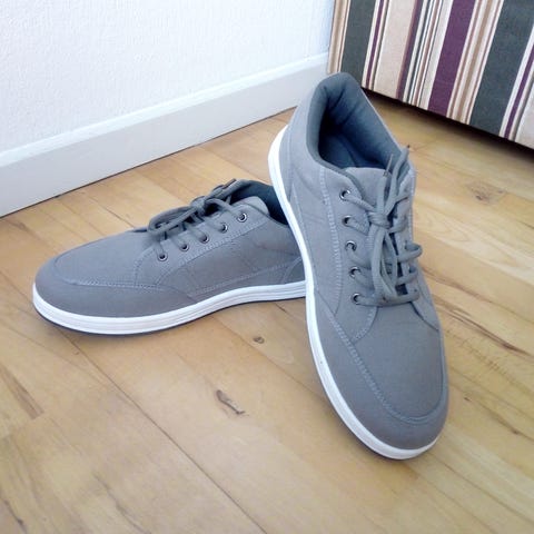 Dette er et par grå herresko i strikmateriale med en solid sål. Skoene har en slip-on design for nem påtagning. Undersiden af sålerne viser moderate tegn på brug, men skoene ser ellers intakte ud. Størrelsen er 44.