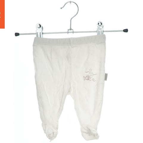 Et par hvide babybukser med et mønster bestående af små grå stjerner. Bukserne har elastik i taljen og er lavet af blødt materiale, der er behageligt for spædbørn at have på. De er velegnede til børn i den tidlige udviklingsfase.