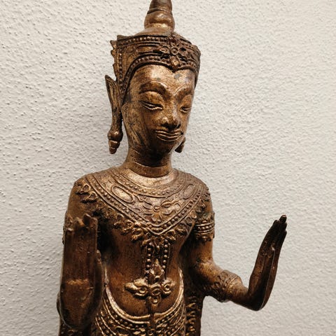 Elegant bordlampe i kunstnerisk keramik fremstillet af den berømte manufaktur Simonetti – Castelli (Italien). Keramikken er emaljeret med koldfinish i bladguld, patineret og med en mørk glasur, der giver en antik bronze-effekt. Figur af Buddha i positionen 'blumisparsha Mudra' (gerningen at røre jorden), symbol på oplysning og stabilitet. Fremragende stand, og man kan mærke Simonettis håndværk. Signeret indgraveret i bunden. Dateringen ligger mellem 70’erne og 80’erne; baggrundens farve er en rødlig terrakotta, så den kunne være ældre.