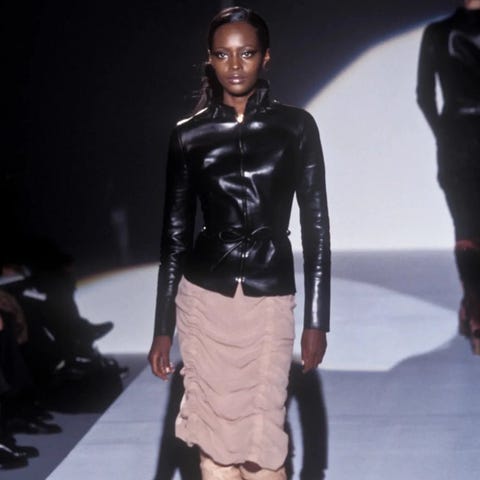 I god stand, storslået kjole signeret Gucci, kendetegnet ved en enkel, tidløs elegance.