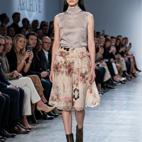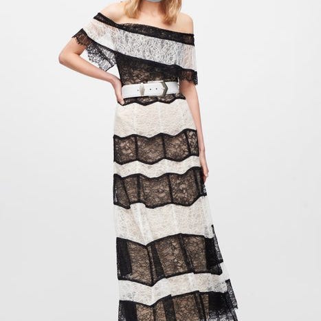 Konstruktionen er yderst kompleks: den plissérede strik veksler med tekniske bånd og geometrisk blondestykker, for et skulpturel og blødt resultat samtidig. Kjolen er nem at have på takket være den stretch-slip-on pasform, uden lynlås eller knapper.