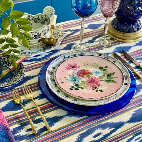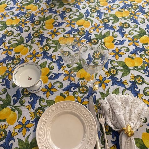 Meget elegant dug med mønster i victoriansk stil med roser på en himmelblå baggrund. Det er et stof, der er særligt designet til borddækning og som kan maskinvaskes ofte uden at farven skades, nemt at kombinere med enhver servis.
