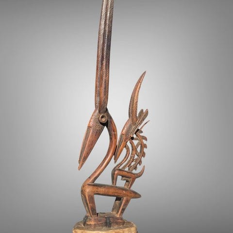 Denne træstatue cimier Tiwara fra Bambara-folket i Mali udgør et centralt element i dets kulturelle og åndelige arv. Tiwaraet, ofte genskabt som en stiliseret antilope, er forbundet med Bambara-folkets grundmyter og landbrugspraksis. Det symboliserer arbejdet med jorden, frugtbarheden og harmonien mellem mennesket og naturen. Udskåret med slanke og afbalancerede former bæres cimieren under rituelle danse, der ledsager landbrugs- og indvielsesceremonier. Genstandens symbolik er stærk, hvor kunst ikke kan adskilles fra tro, ritualer og overlevering af værdier inden for folket.