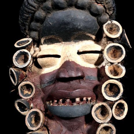 Meget smukt, yderst stiliseret maske, skiftende parallele striber i to nuancer, hvis dybder fremhæver kontrasterne, smuk knudret patina, denne type maske bliver nogle gange præsenteret som Kela eller Kela-Yela
