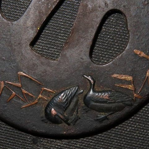 Originalt Edo-periode smedet jern tsuba af Daito Zingo med sølvinlæg, målene 8,3 cm høj, 7,7 cm bred, 0,3 cm tyk, vægt 120–180 g med æske. Klik på den blå "gå til varen" knap, for at købe eller byde på denne vare. Den samlede pris vil blive vist inden du afgiver dit bud.