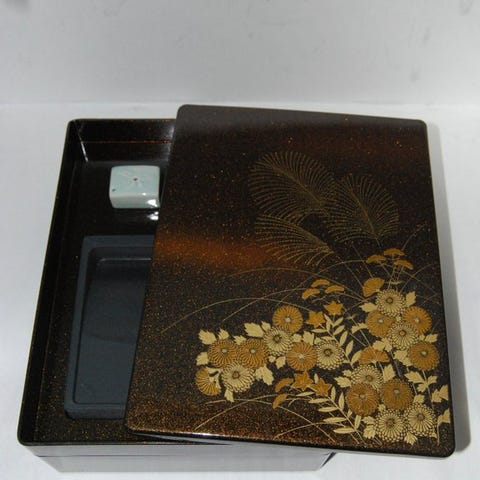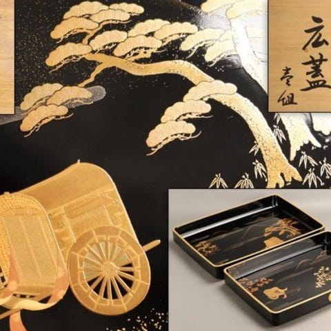 Forfinet sort lakkert træfubako fra Japan af Suzuzen (Aizu lakkeringsværk), gylden taka maki-e landskab med fyr, plommeblom, bjerge, bro, flod og hytte; mål 26 x 18,5 x 6,5 cm; god stand med tegn på ældning. Klik på den blå "gå til varen" knap, for at købe eller byde på denne vare. Den samlede pris vil blive vist inden du afgiver dit bud.
