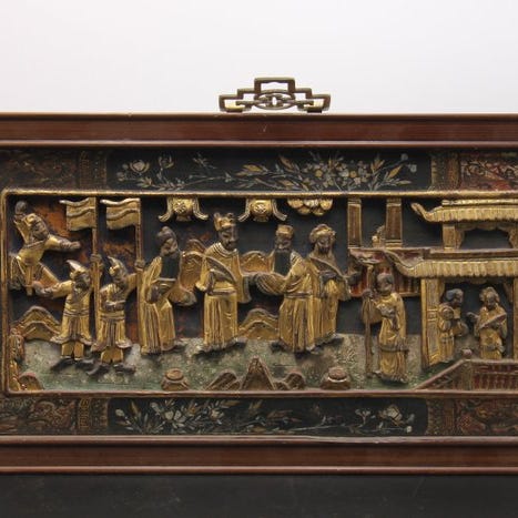 En dejlig antik kinesisk træudskæring, der forestiller en fint udskåret elefant, skade, hare blandt snesevis af vaser, røgelsesbrændere, tekander, lærdes skatte og en stor vase med peoner. Alt står på stativer, lærde klipper og et lærdebord. I nederste hjørne et Lingzhi. Meget detaljeret og udskåret.