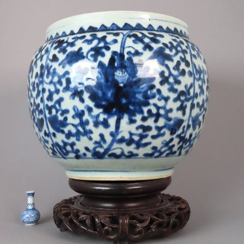 En blå og hvid krukke med sammenflettede lotusmønstre - Porcelæn - Kina - Qin...
