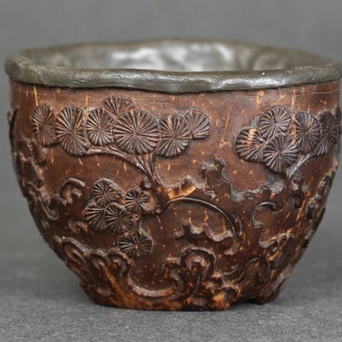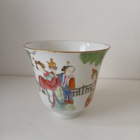 Et sæt antikke, farverige, pænt formede og udskårne skåle og underkopper fra republikken.