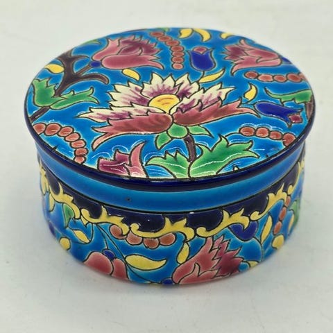 Dette er en 19. århundredes håndmalet æske fra England, Birmingham omkring 1800-1850 i rokoko-stil.