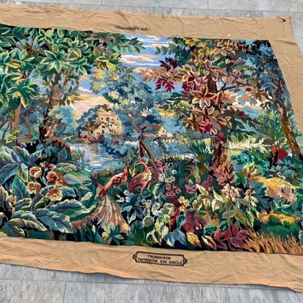 Fransk begrænset udgave vævetæppe fra 1970–1980, dimensioner 127 cm × 63 cm, uld, nålepunkt kædestich, batch 515, i god stand med tegn på alderdom. Klik på den blå "gå til varen" knap, for at købe eller byde på denne vare. Den samlede pris vil blive vist inden du afgiver dit bud.