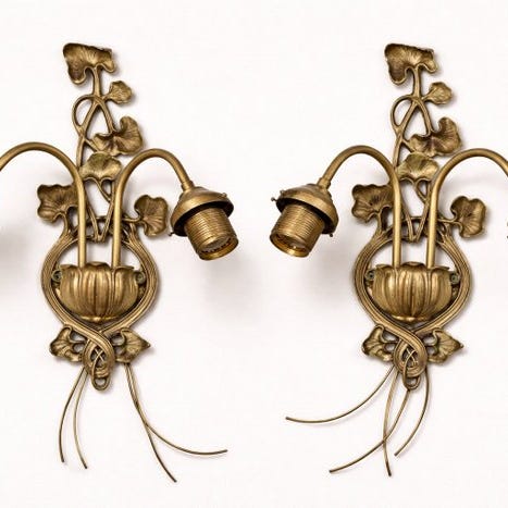 Elegant par af væglamper i vintage metalguld, udført i Hollywood Regency / Florentine (Tole) stil, kendetegnet ved raffinerede blomstmønstre malet i hånden.