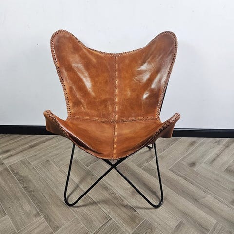 Pragtfuld sommerfuglestol med sæde af brunt tykt læder. Øjenfanger!