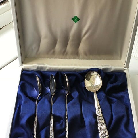 Sælges med den originale æske og 2 Christofle-skeer i sølvbelagt metal, model Marly.